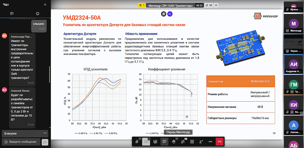 Участники получили подробную информацию о ключевых характеристиках отечественных GaN СВЧ-транзисторов, разработанных специалистами «ПКК Миландр», узнали об особенностях их применения в усилителях мощности и перспективах использования в современных радиоэлектронных системах. Активное участие аудитории, включая множество технических вопросов, подтвердило высокий уровень вовлеченности и актуальность темы.