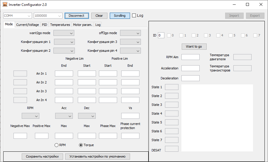 Создана программа Configurator_Inverter для настройки тяговых инверторов нашего производства и управления электродвигателем с ПК.