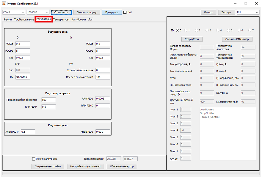 Для тяговых инверторов в ПО Configurator_Inverter добавлена настройка динамики работы регулятора оборотов и угла ротора тягового электродвигателя.
